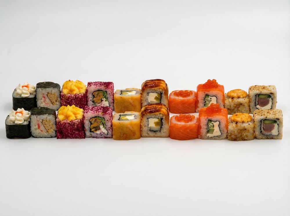 Запеченный ролл - рис, нори, сыр творожный, мидии, лист салата, сумак, крем-икрима Холодный ролл - рис, нори, сыр творожный, форель, огурец, икра Запеченный ролл - рис, нори, сыр творожный, бекон, тунец, огурец, шапка сырная, лук криспи Темпура ролл - рис, нори, сыр творожный, кальмар копченый, дайкон, темпура , сырный соус, терияки соус, сумак Холодный ролл - рис, нори, снежный краб, омлет тамаго, сливочная шапочка, чили соус